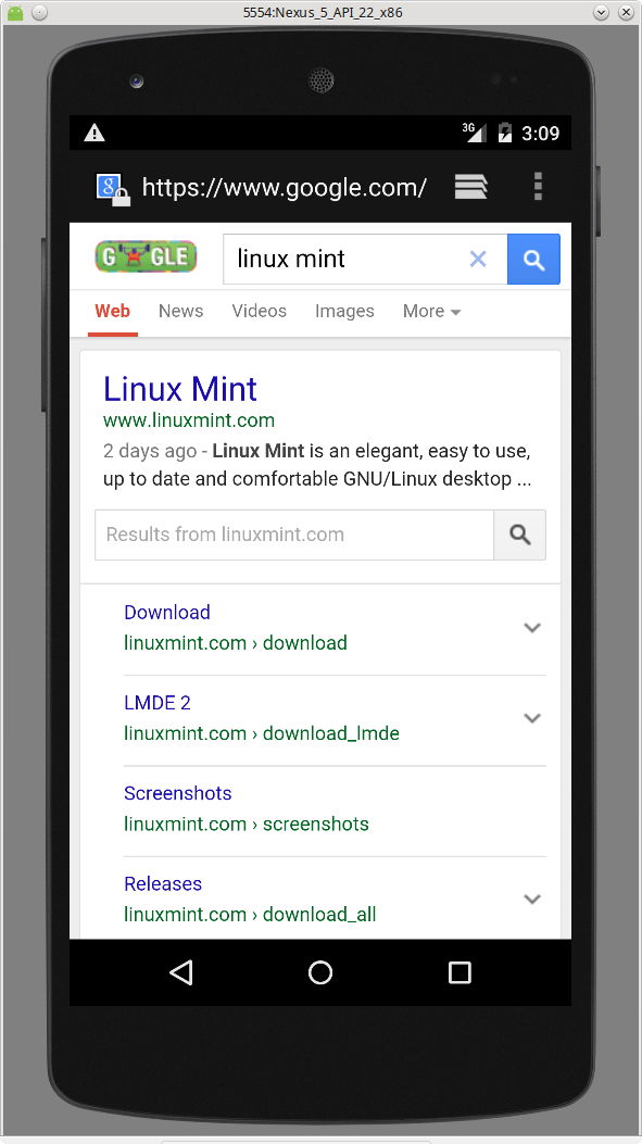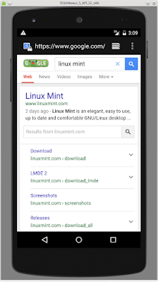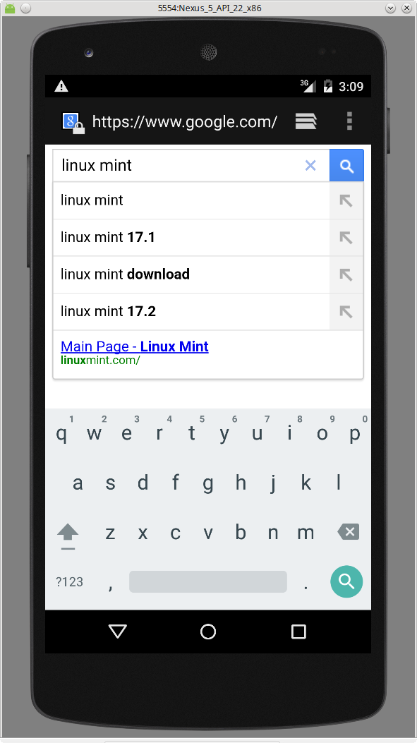 Type something into the Google search box, using the on-AVD-screen keyboard – for example ‘linux mint’ (see below).