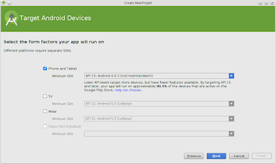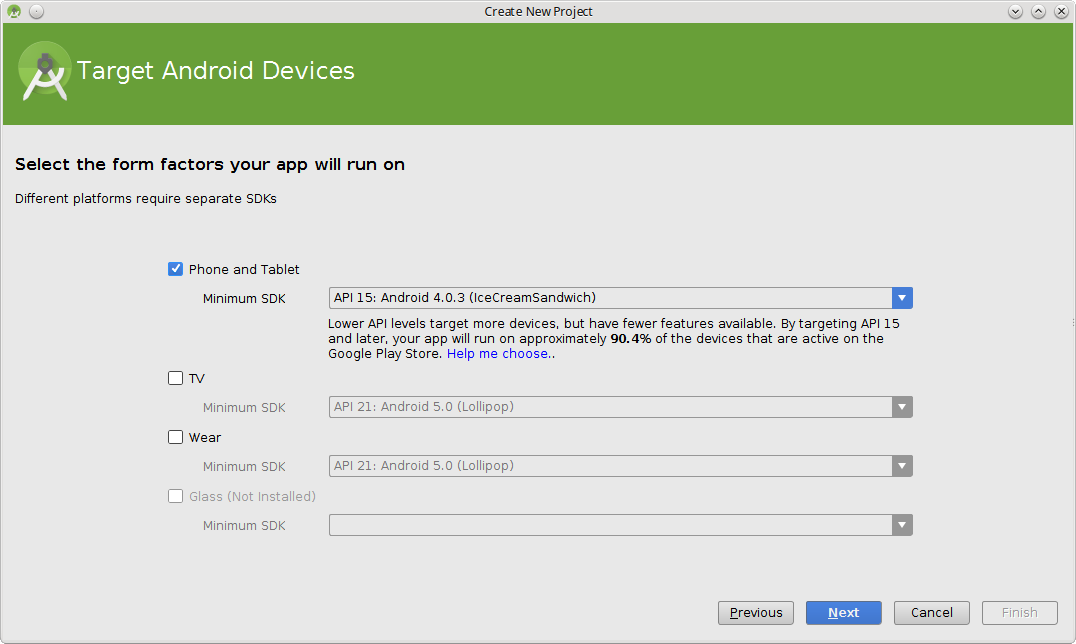 The ‘Target Android Devices’ screen will appear next (see below). Make sure that the ‘Phone and Tablet’ item is selected. The ‘Minimum SDK’ is pre-selected to be ‘API 15: Android 4.0.3 (IceCreamSandwich)’ and the reason why is as stated in the note below this field. If you are unsure on which minimum SDK to select, you can click on the ‘Help me choose’ item. For this tutorial, leave it at the pre-selected minimum SDK. Then click on the ‘Next’ button.