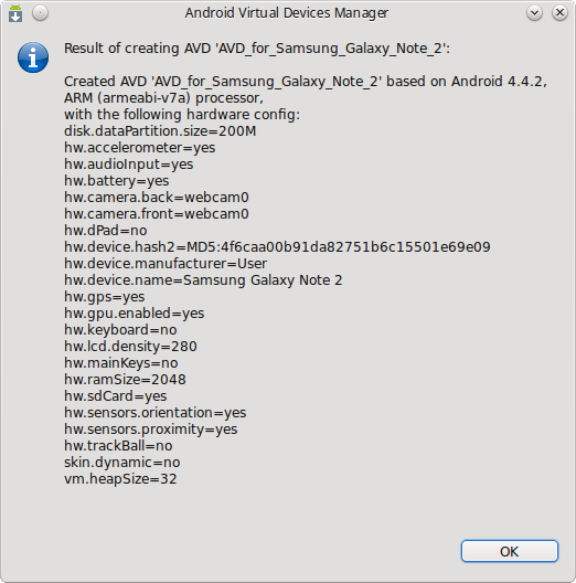 Click the ‘OK’ button to create the new AVD. A log window will appear (see below) informing you of all the settings for the newly-defined AVD. Note that any error messages will also appear in this window – in this case, there are none. Click on the ‘OK’ button to dismiss the window.