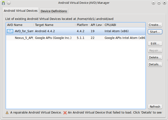 You can now play around with the Nexus 5 AVD – notice how fast the response is, thanks to Virtualization Technology plus Linux’s KVM features. You can safely close the AVD by clicking on the ‘x’ on the top right hand of the window. You will then be back to the AVD Manager window.