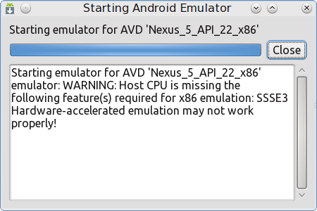 Click on the ‘Launch’ button to launch the AVD. A ‘Starting Android Emulator’ window will appear (see below). If, for some reason, the loading was slow and/or errors occurred, it is possible that hardware virtualization plus Linux’s KVM (Kernel-based Virtual Machine) features are NOT supported in your PC. This will often happen if your PC is NOT using the newer version of an x86 compatible CPU – for example your PC is using an very old AMD CPU. It also can happen if you don’t have Virtualization Technology enabled in BIOS and you are using Intel Atom x86 CPU/ABI in your AVD. Alternatively, the KVM module is NOT loaded into your Linux kernel.