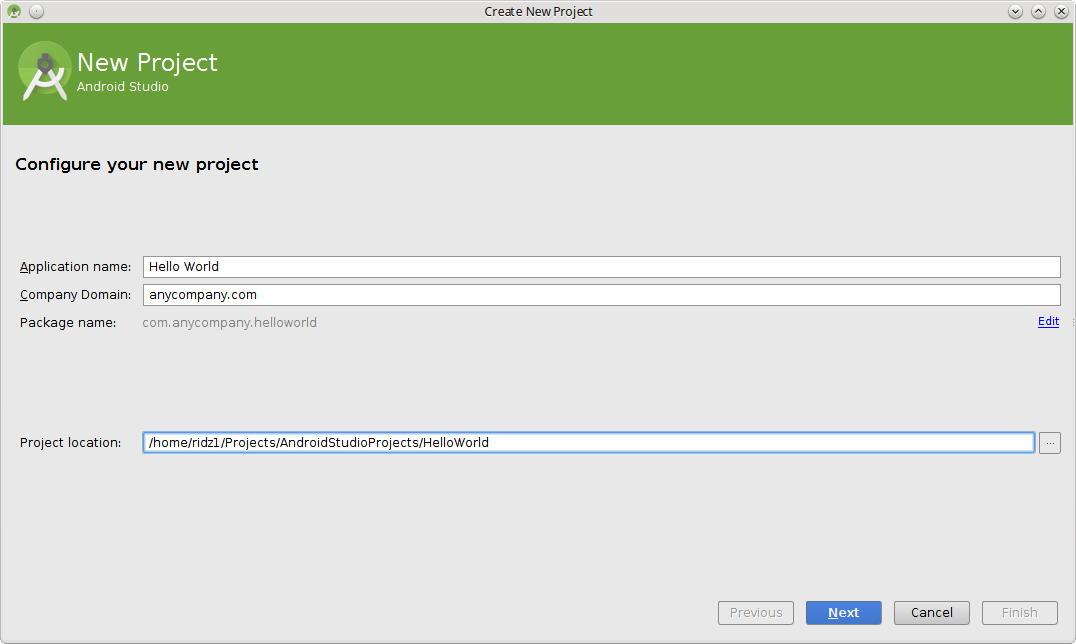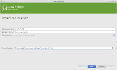 The ‘New Project’ screen as shown below will appear – fill in the details for the ‘Application name’ to ‘Hello World’ and ‘Company Domain’ to ‘anycompany.com’ as shown. The directory in which this project reside can be anywhere on your PC. In the example shown, I have placed the project in my home folder’s ‘Projects’ directory but you are free to use any directory you wish. Then click on the ‘Next’ button.