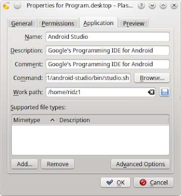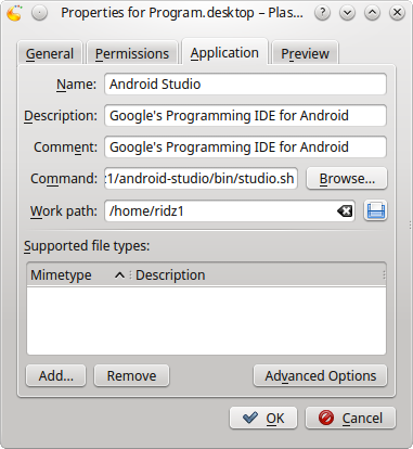 - Click on the ‘Application’ tab and in the name field enter ‘Android Studio’. In the comment field enter ‘Google’s Programming IDE for Android’. To set the command field, first click on the ‘Browse...’ button, navigate to the ‘android-studio/bin’ sub-directory in your home directory and select the ‘studio.sh’ file. In the work path field set it to your home directory using the folder button to the right of this field. Leave the other fields blank and click on the ‘OK’ button.