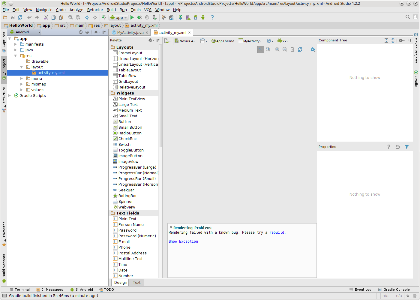If this is the first time you are using Android Studio, the next screen will take some time to appear while the system will carry out indexing of the IDE – the word ‘Indexing...’ will appear in the bottom of the IDE window. The next screen may look like the one shown below – if not skip to the next paragraph. Note the ‘Rendering Problem’ message which states that ‘Rendering failed with a known bug. Please try a rebuild.’ Click on the ‘rebuild’ item, and wait a while for the renderer to rebuild.