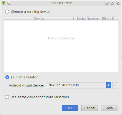 To run this project on your AVD emulator that you have created, click on the ‘Run’ button (the one in Android Studio’s tool-bar that looks like a green-colored right pointing arrow) and the ‘Choose Device’ screen (see below) will appear. Note that the ‘Launch emulator’ item has been selected and that you don’t have any other running device (‘Nothing to show’ will be present in the top half of the window). Make sure that the Nexus 5 AVD is selected.