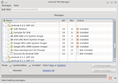 Depending on what Android devices that you wish to develop software for, you may wish to install additional packages for that device. For example, the author has an Android smart phone running Android version 4.4.2 (KitKat), so the packages marked as shown below, was selected to be installed. The ‘Install 6 packages...’ button was then clicked upon and the packages were downloaded and installed. Do not close the SDK Manager yet.