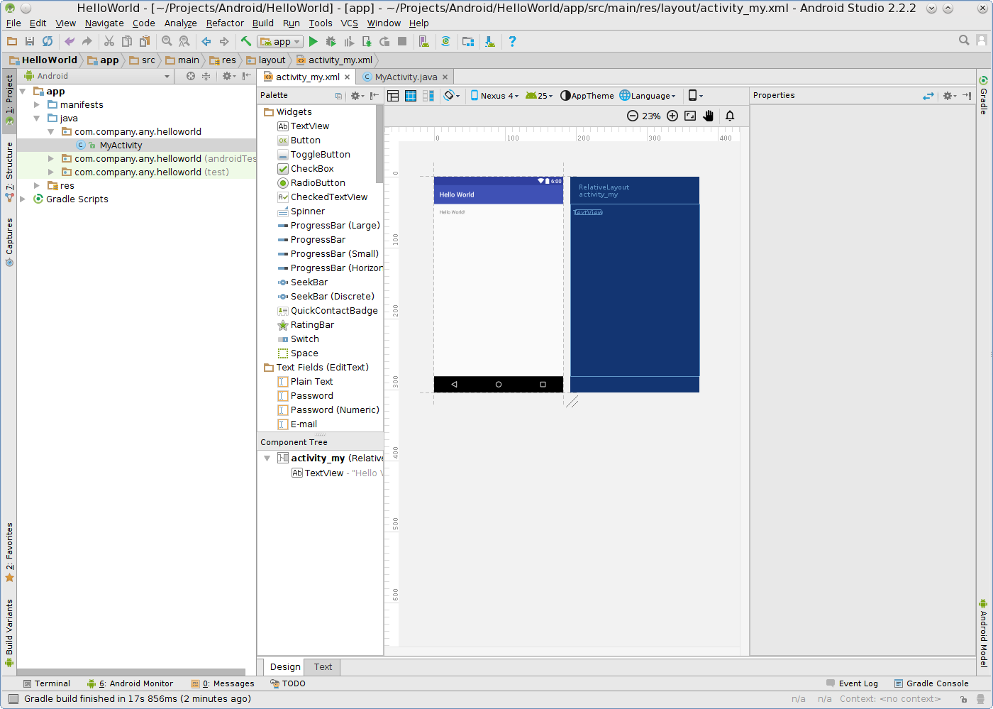 After the system has finished indexing, a window similar to the one shown below will appear. Note that it shows the source for the package ‘MyActivity’ Java class. Click on the ‘activity_my.xml’ tab and the screen as shown below will appear. Note that it does contain a graphic of a Nexus 4 device with the ‘Hello World!’ text on it. This, however, is NOT the output of the project.